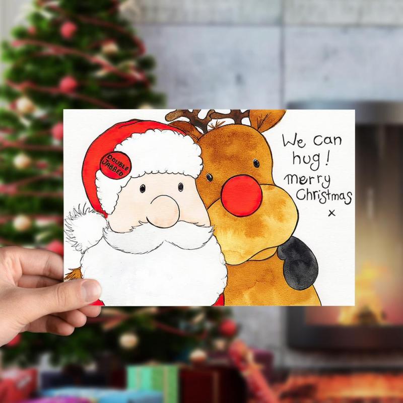 We Can Hug Merry Christmas Santa with Rudolph Christmas Card-Horizontal Card