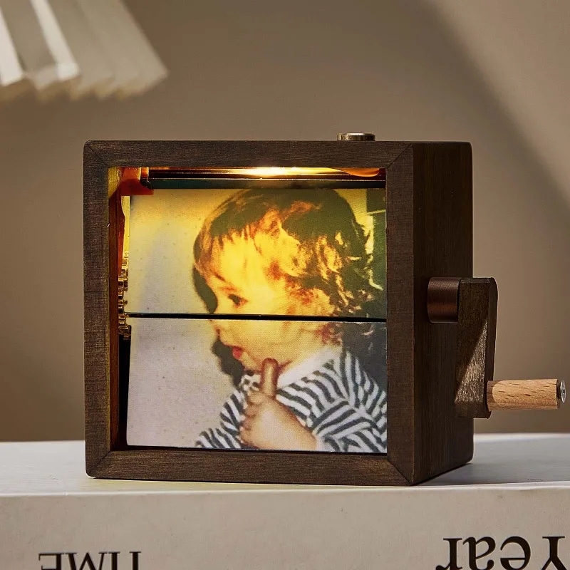 Custom Hand-Crank Flipbook Box Animation Machine Mechanical Personalized Hand-cranked Photo Album with Light Black Walnut Baby Photo Cube Frame Creative Gift